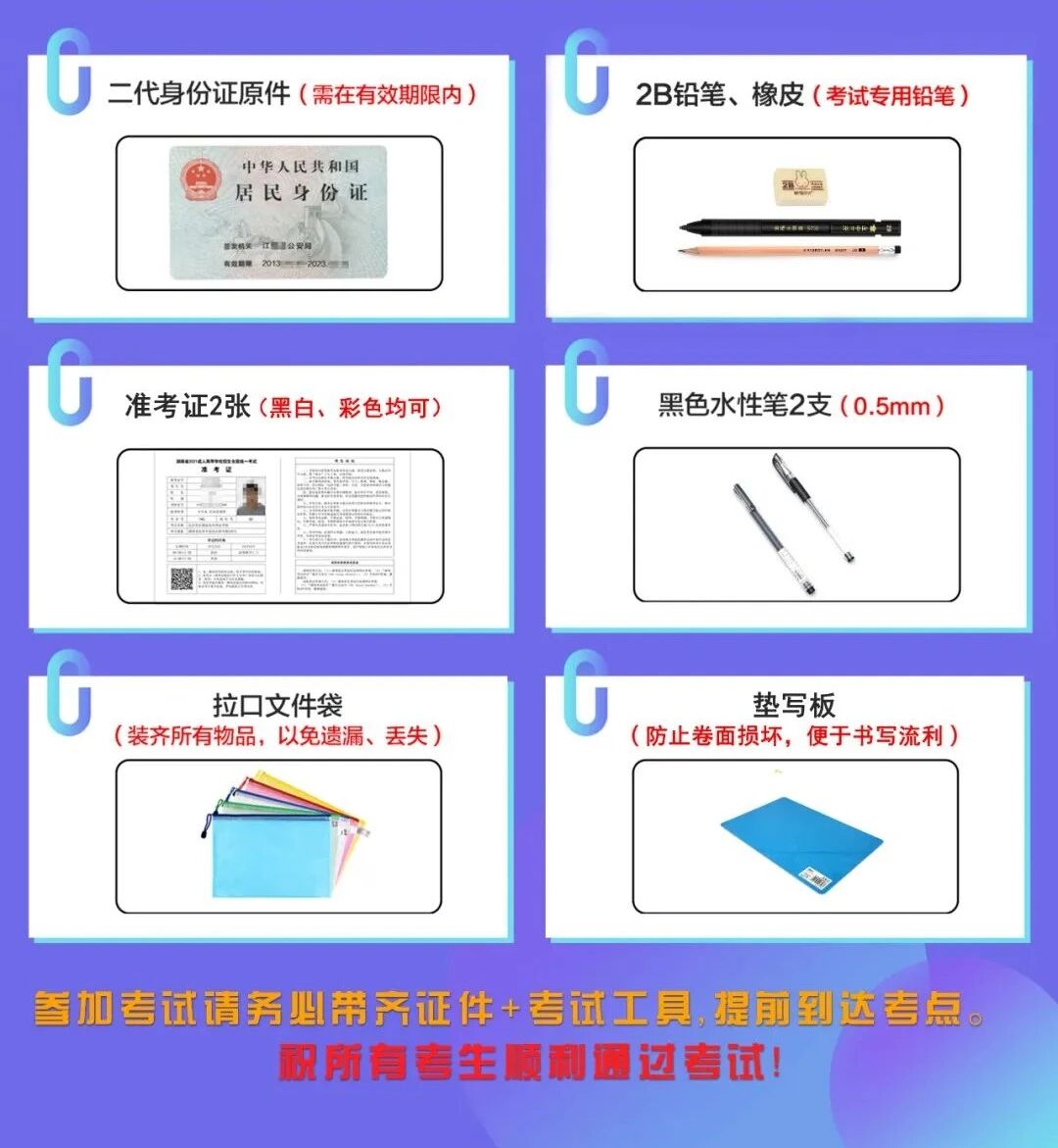 1、身份证原件(有效期内);2、准考证(建议打印2~3份);3、考试用具:黑色签字笔(至少准备2支)、2B铅笔、橡皮擦、垫板、拉口文件袋等;