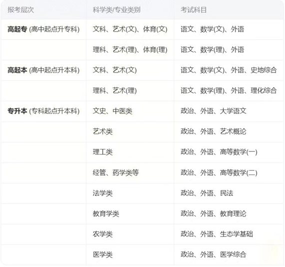 根据你选择的层次和专业,考试科目组合不同: