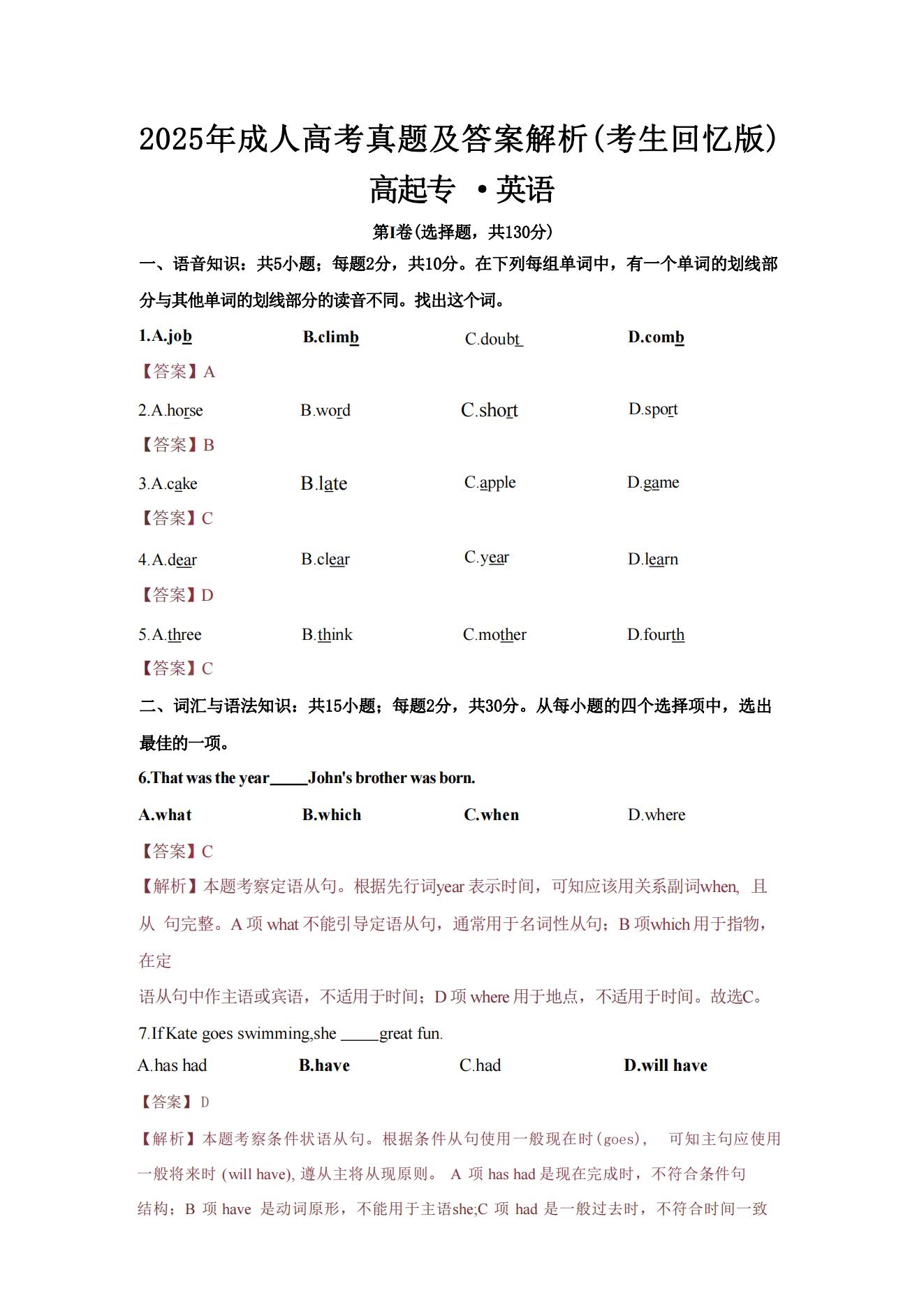 2025年成人高考高起专英语真题及解析(考生回忆版)
